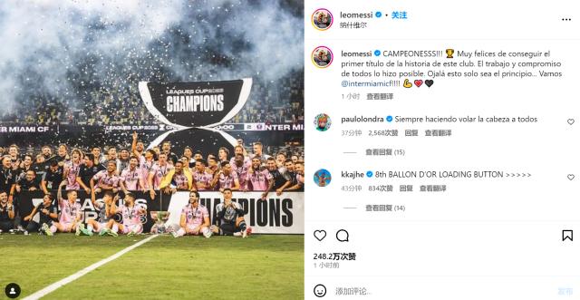 在Instagram网站,梅西只发了一张迈阿密国际全队首捧北美联赛杯冠军奖杯庆祝的照片。在推特个人账户上,他发了三张照片。前两张是全队庆祝夺冠的照片,第三张则是他拥抱迈阿密国际门将德雷克·卡伦德的照片。